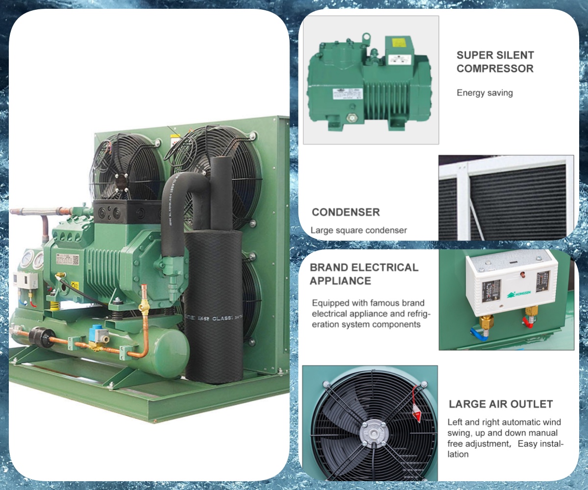 Bitzer condensing units deliver powerful, efficient cooling. They excel in reliability and adaptability for diverse applications,from commercial refrigeration to industrial processes. These units are engineered for easy installation and low lifetime costs,making them a trusted choice for high-performance cooling solutions worldwide.It’s equipped with famous brand electrical appliance and refrigeration system components.